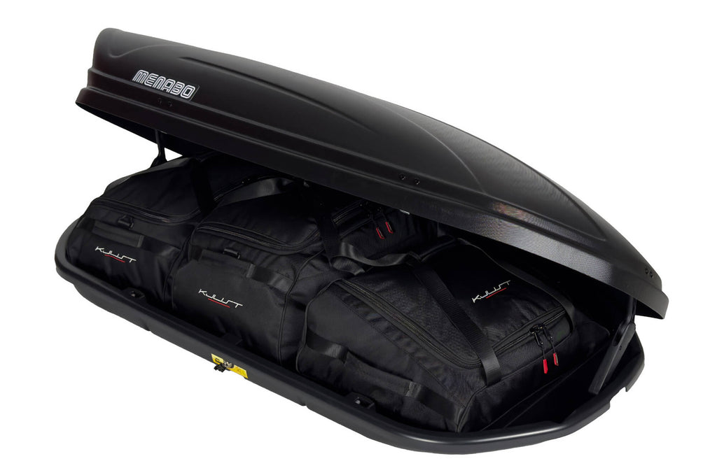 Maximaliseer de ruimte van je Menabo Marathon 400 met de op maat gemaakte KJUST tassenset. De drie tassen benutten de ruimte optimaal, zorgen voor efficiënte verpakking en veilig transport. Met deze tassenset hoef je je nooit meer zorgen te maken om de dakkoffer.