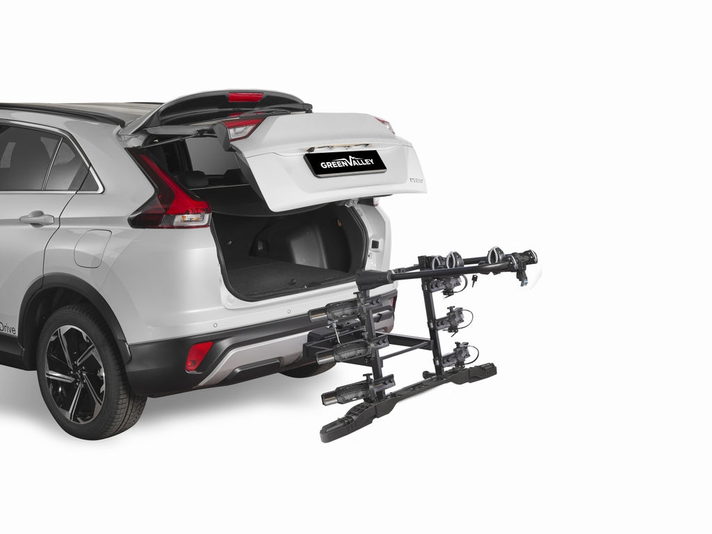 Met de Green Valley Tourer 3 neem je drie (elektrische) fietsen tot 60 kg veilig mee. Met het dubbele anti-diefstalsysteem met een slot op de koppeling én op het frame, zijn zowel je fietsen als de drager goed beveiligd. Het handige kantelsysteem zorgt ervoor dat je altijd bij je kofferbak kunt, zelfs met fietsen op de drager. Na gebruik klap je de drager eenvoudig in, zodat je hem gemakkelijk kunt opbergen.