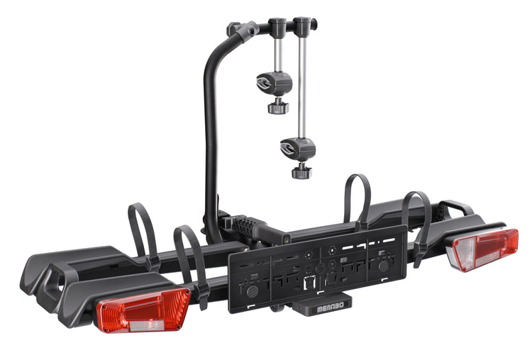 De Menabo Orbit 2 is een stevige fietsendrager voor 2 fietsen die eenvoudig op de trekhaak wordt gemonteerd dankzij het snelle bevestigingssysteem. De robuuste stalen constructie heeft een draagvermogen tot 70 kg en is daarmee geschikt voor e-bikes en fatbikes. Met het voetbediende kantelsysteem houd je toegang tot de kofferbak zonder de fietsen te verwijderen. De brede wielgoten zorgen voor stabiliteit en de geïntegreerde vergrendeling voorkomt diefstal.