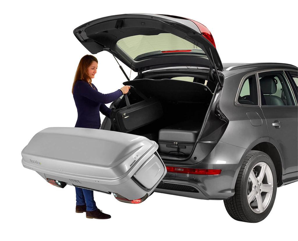 Die BackBox ist die Gepäckbox, die mit Ihren Bedürfnissen wächst. Sie montieren sie einfach an der Anhängerkupplung mit Hilfe des BackCarriers. Mit einem variablen Volumen von 300 bis 326 Litern mit den Einsätzen bietet sie Platz für beispielsweise 4 Paar Skier oder 2 große Golftaschen. Dank austauschbarer Seitenpaneele können Sie sogar Skier bis zu 187 cm transportieren. Die Box ist aus hochglänzendem, kratzfestem Material gefertigt und mit LED-Beleuchtung, Spanngurten, Schaumstoffeinlagen und Entwässerungsventilen für optimalen Schutz und Benutzerfreundlichkeit ausgestattet. Achtung: Die maximale Geschwindigkeit beträgt 160 km/h. Bei leistungsstarken Fahrzeugen mit ungünstiger Auspuffposition kann ein zusätzlicher Hitzeschild erforderlich sein - kontaktieren Sie hierfür unseren Kundenservice.