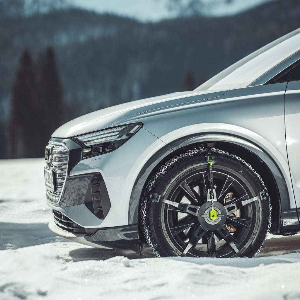 Der Veriga Tractiva SUV ist neuer Laufflächen Schneekette besonders für SUVs, Camper und andere schwere Fahrzeuge. A Laufflächen Schneekette Kann an Autos montiert werden, wo keine Kettenschalter hinter dem Autoreifen haben darf.