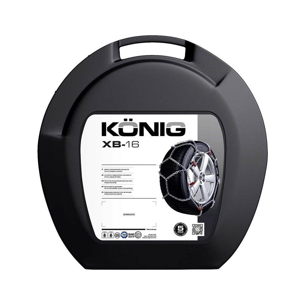 De König XB-16 sneeuwketting is een ketting van hoge kwaliteit die in 2 stappen monteerbaar is. Dankzij de kleurgecodeerde schakels is deze ketting zeer makkelijk monteerbaar. Deze SUV sneeuwketting is een handspan sneeuwketting dit betekent dat je een klein stukje moet rijden na montage, vervolgens even stopt om de ketting nog na te spannen met de hand. Deze ketting is voorzien van het micro-regulatiesysteem, dat zorgt continu voor een juiste spanning tijdens het rijden. De platte schakels van de XB-16 hebben een hoogte van 16 mm en zorgen door deze vorming voor een comfortabelere rit dan een normale ketting en dus ook voor minder geluid en vibraties. De ketting is voorzien van diverse keurmerken zoals TUV, Ö-Norm 5117, UNI 11313.