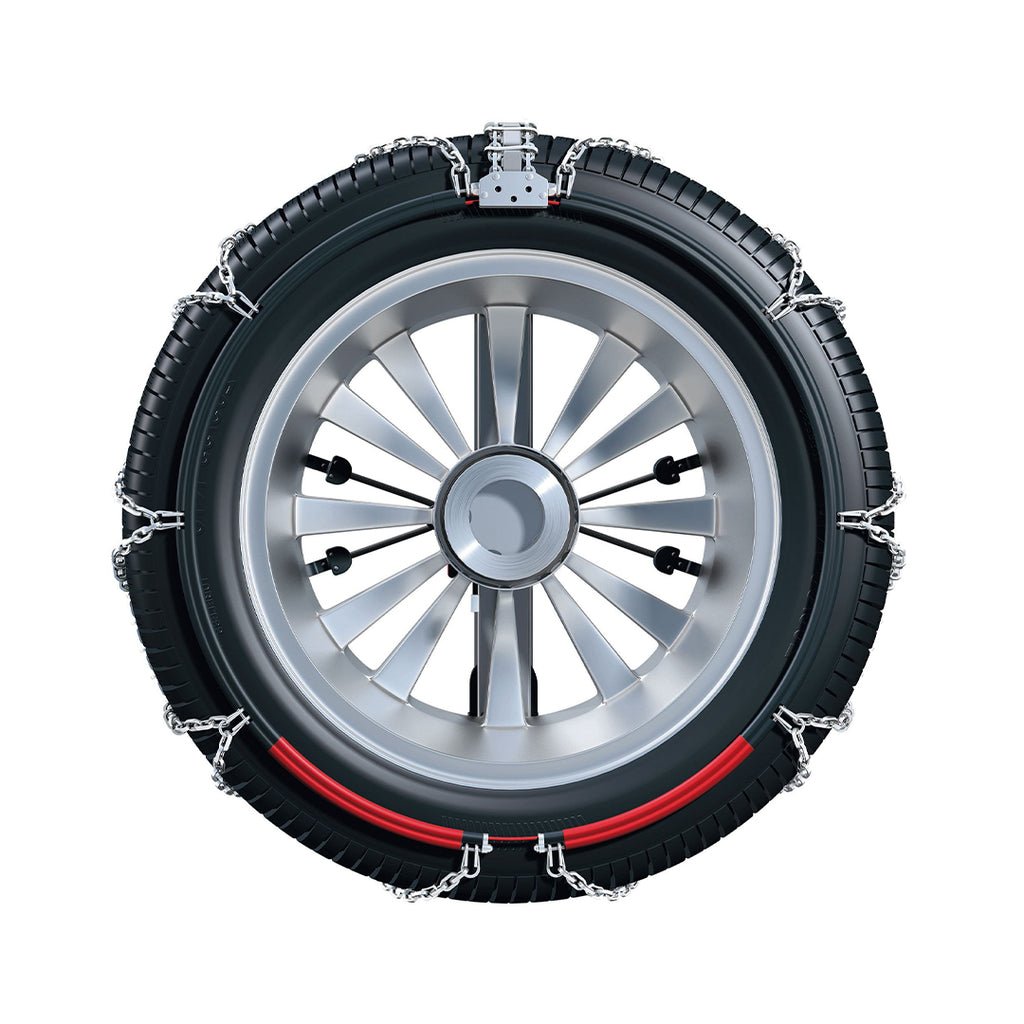 De König Easy-fit SUV heeft een schakeldikte van 10 mm en is binnen 12 seconden te monteren. De sneeuwketting is voorzien van een aluminium middenstang met een automatisch spanningssysteem: klap het ingebouwde pedaal uit en activeer het zelfspannend systeem met je voet. De ketting glijdt vanzelf om de band zodra de auto gaat rijden. Demonteren gaat even eenvoudig: Druk gelijktijdig op de rode knoppen op de aluminium stang en ontkoppel de veiligheidsgrendel om de ketting los te maken. Je kunt nylon bumpers aanbrengen om alu velgen te beschermen.