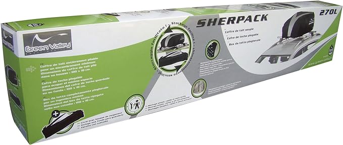 De Green Valley Sherpack is een flexibele en opvouwbare dakkoffer met een inhoud van wel 270 liter, ideaal voor wie extra bagageruimte nodig heeft met een beperkte opslagruimte. De dakkoffer is geschikt tegen alle soorten weersinvloeden. Ondanks het vouwbare ontwerp is de dakkoffer stabiel door de metalen ondergrond in de dakkoffer. De dakkoffer kan maximaal 50kg verdragen, gemakkelijk en praktisch voor al je uitstapjes.